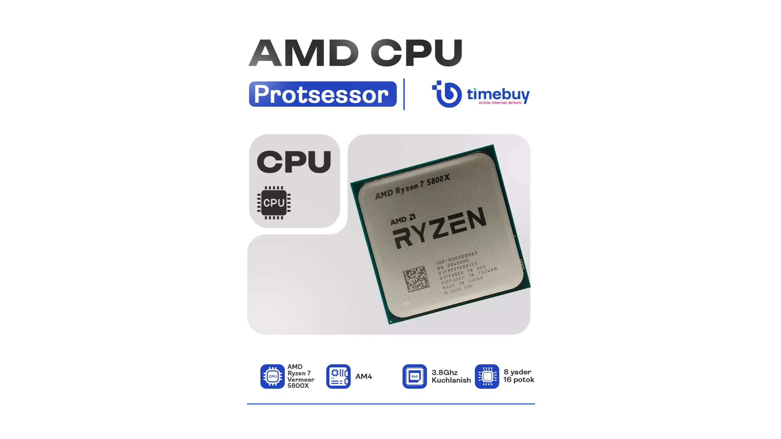 AMD Ryzen™ 7 Vermeer 5800X - 3,7 gigagertsli, 8 yadro/16 ip, GPU yo‘q, AM4 (100-000000063), Oem